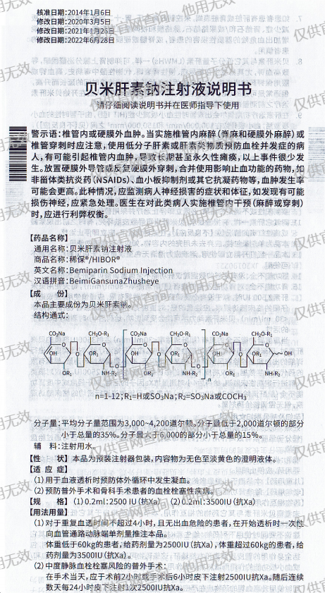 (1)對(duì)于重復(fù)血透時(shí)間不超過(guò)4小時(shí),且無(wú)出血危險(xiǎn)的患者,在開(kāi)始透析時(shí)一次性其向血管通路動(dòng)脈端單劑量推注本品。體重低于60kg的患者,給藥劑量為2500IU(抗Xa),體重超過(guò)60kg的患者,給藥劑量為3500IU(抗Xa)。