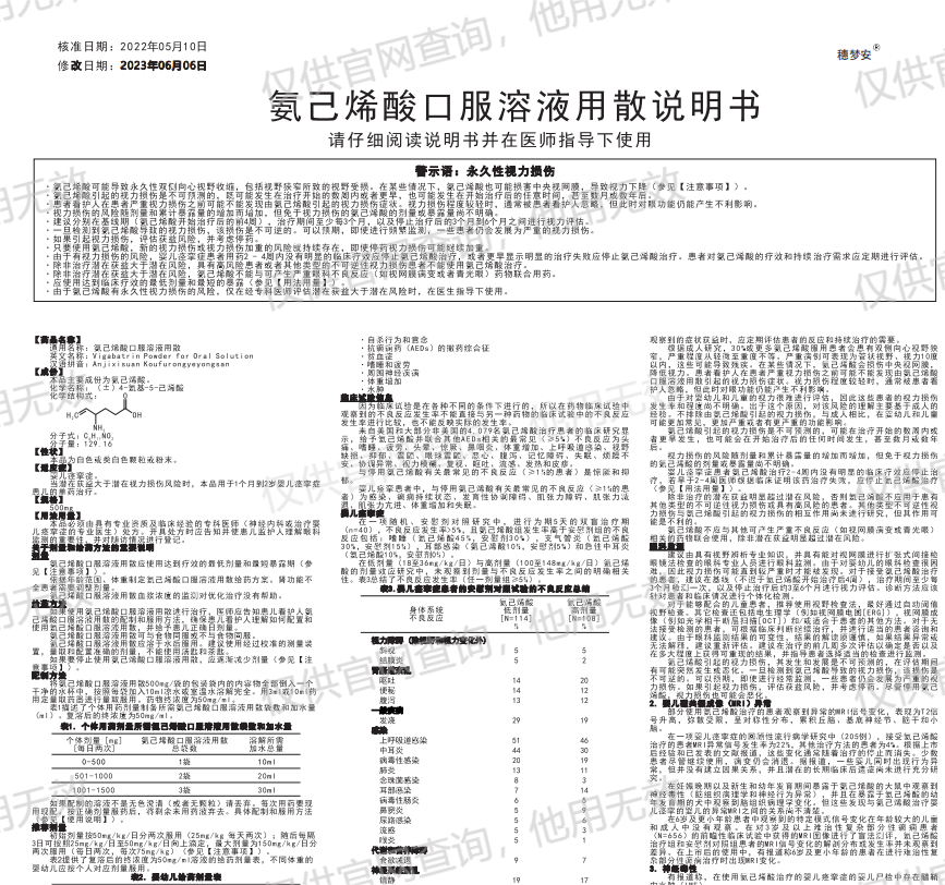 嬰兒痙攣癥。當(dāng)潛在獲益大于潛在視力損傷風(fēng)險(xiǎn)時(shí), 本品用于1個(gè)月到2歲嬰兒痙攣癥患兒 的單藥治療。